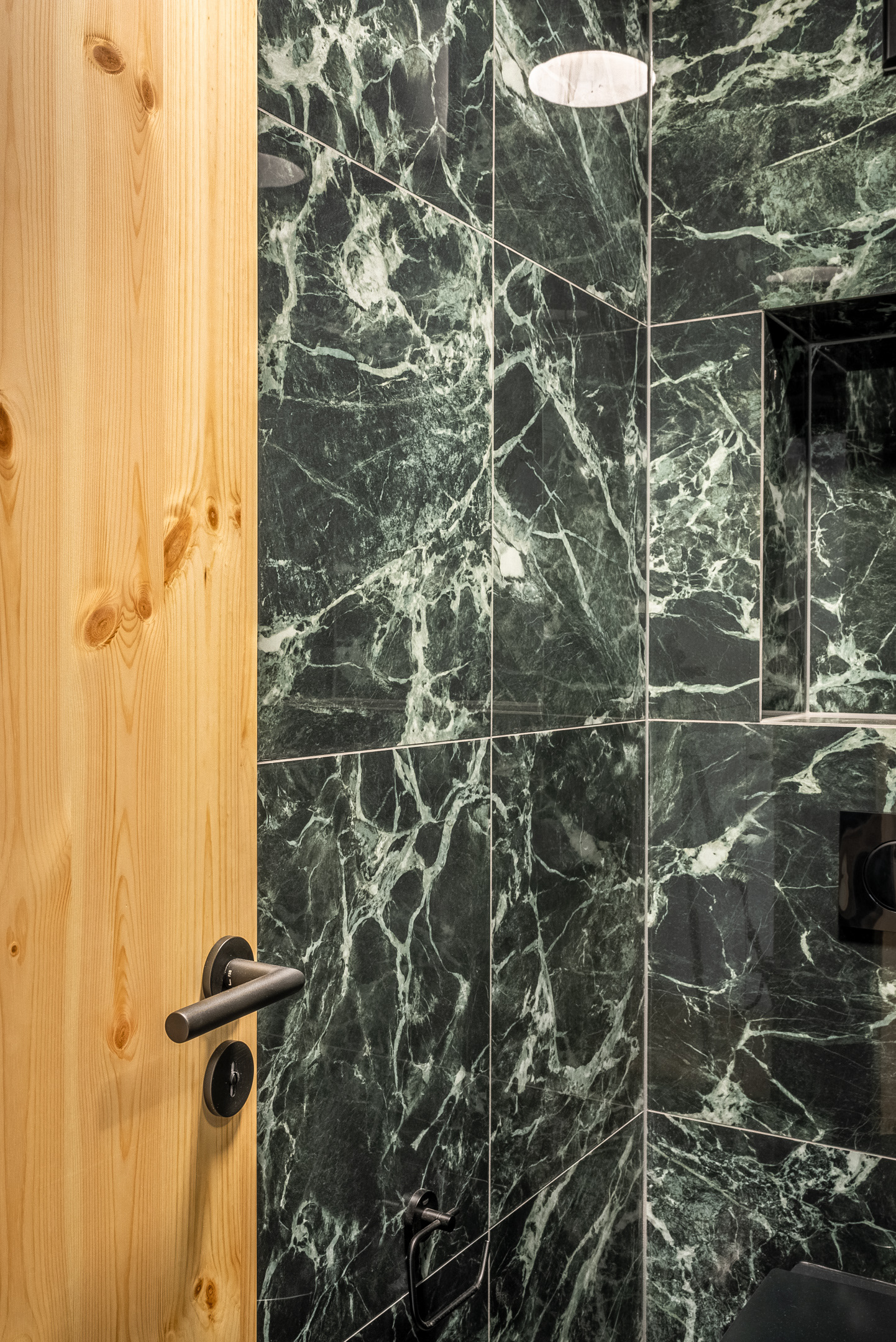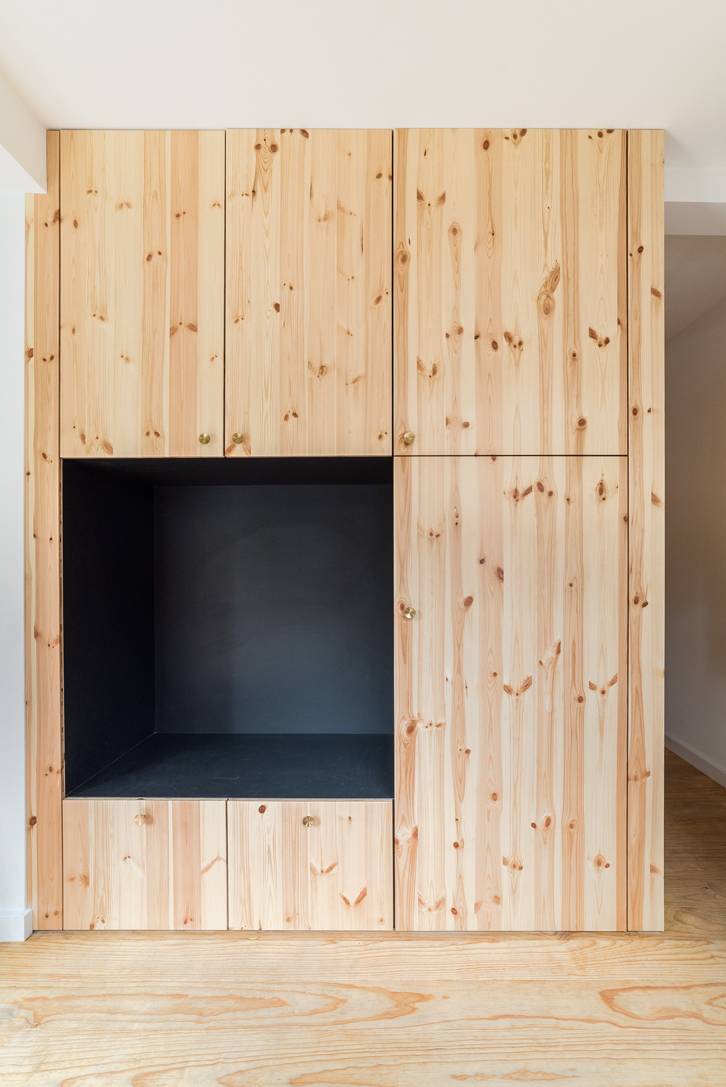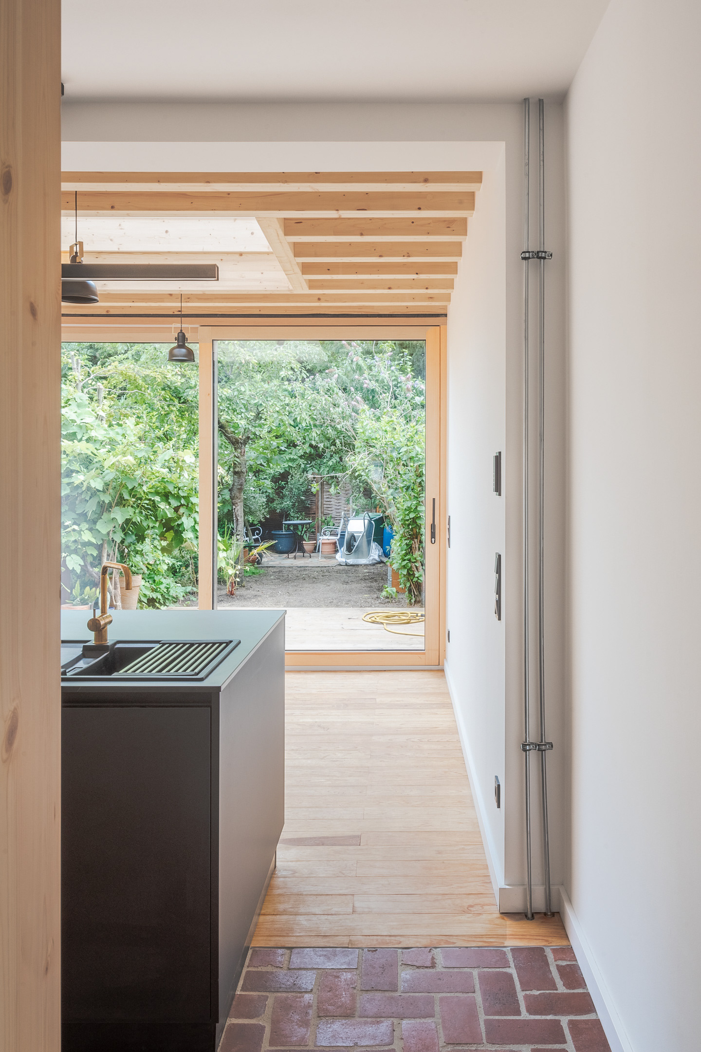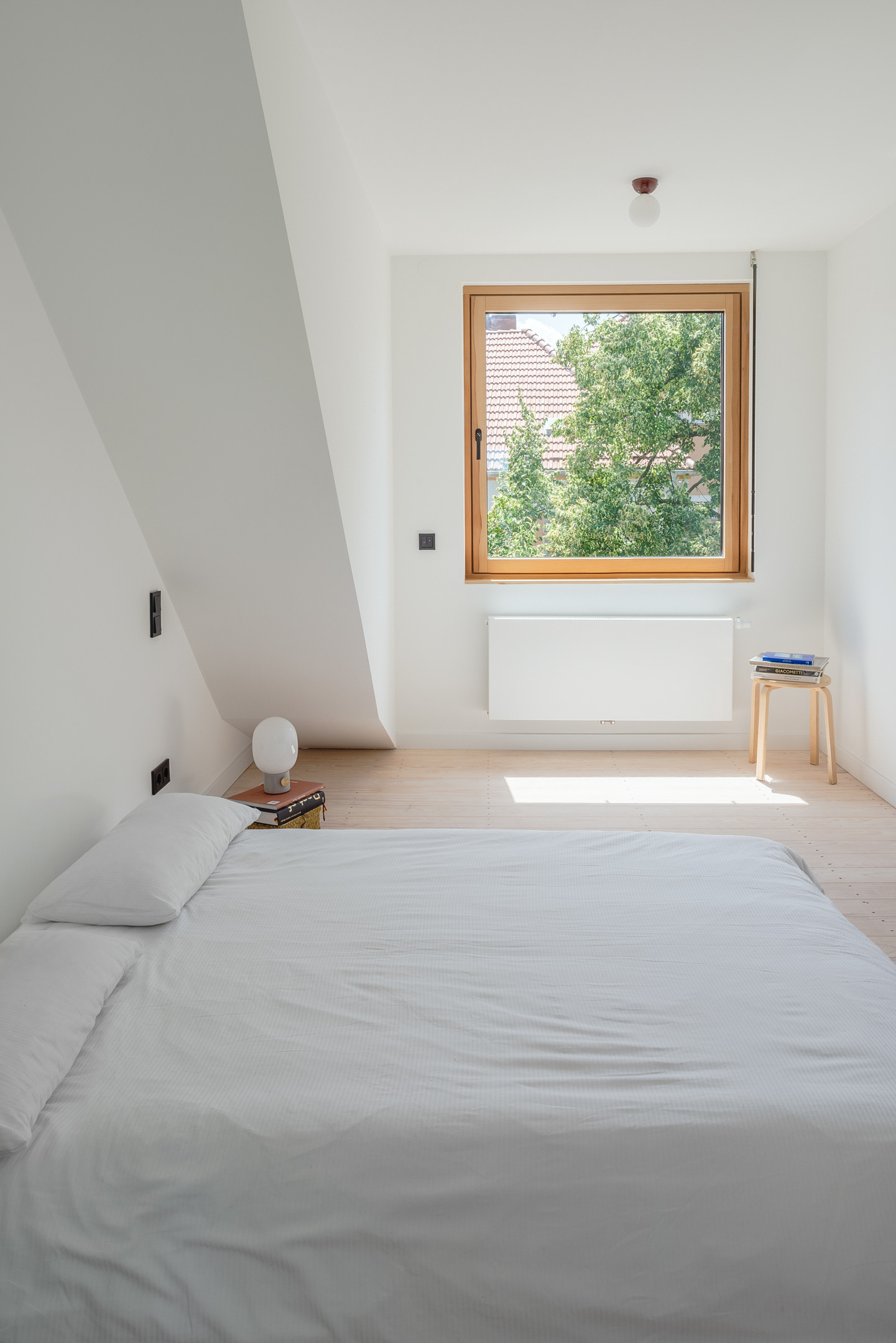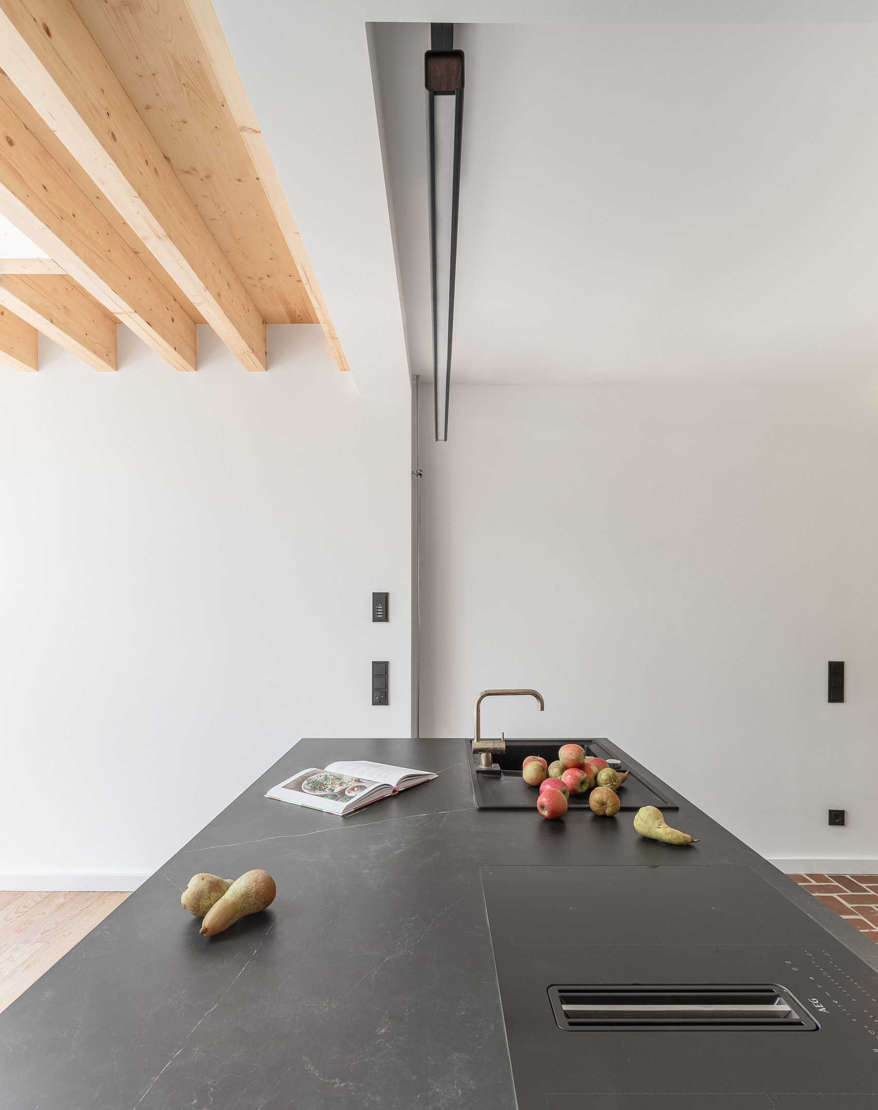 Die Erdgeschosszone wird durch einen Anbau zur nördlichen Gartenseite hin erweitert und dank eines Oberlichts mit begrünten Dach natürlich belichtet. Gemeinschaftliches Kochen und Speisen findet trotz des beengten Grundrisses Luft und Platz mit Blick in den eigenen Garten. Durch die Erweiterung des Dachgeschosses mittels Dachgauben kann das neue Schlafzimmer mit Einschbauschränken, einem zusätzlichen neuen Bad und großem Gaubenfenster Rückzug fernab des Trubels im Erdgeschoss bieten